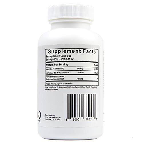 Specification: Advanced Skin Care Antioxidant Supplement Capsules – Vitamin D3 5000IU Plus Nicotinamide/Niacinamide/Niacin 500mg (Vitamin B3) and Polypodium Leucotomos (Fern Extract) 480mg