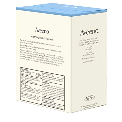 Aveeno Soothing Bath Treatment (8 Single Use Bath Packets). Made of 100 % pure colloidal oatmeal, a long recognized ingredient that relieves itching naturally,this Aveeno Bath Treatment disperses in your bathwater to treat itchy, dry, or irritated skin. Also gently cleanses and moisturizes for soft, smooth and healthy looking skin, even sensitive skin is relieved. Recommended by professionals for the soothing relief of itchy, irritated or dry skin.