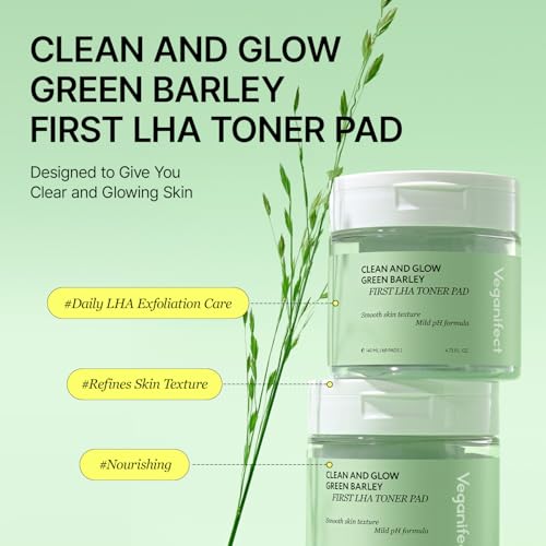 Specification: Clean and Glow Green Barley First LHA Toner Pad, Vegan Certified, Daily Exfoliating, Improving Skin Texture, 60 pads