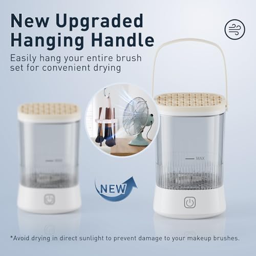 【Compatibility with All Size Makeup Brushes】Equipped with an upgraded silicone fixed cover, our cleaner accommodates a diverse range of brush sizes, ensuring a thorough clean for every brush in your collection. The enhanced hanging handle adds convenience, enabling you to hang and air-dry your brushes effortlessly. Note that high-speed spinning drying may cause bristles to splay or fray; thus, we recommend natural air drying.