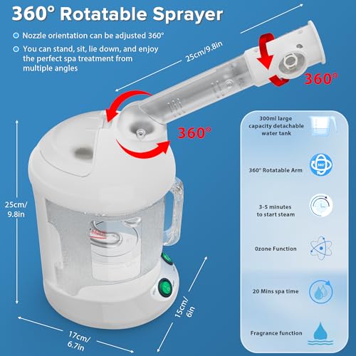 Specification: Facial Steamer, Nano Ionic Warm Mist Face Steamer with Detachable Cleanable Water Tank, Portable Face Humidifier with 360° Rotating Arm