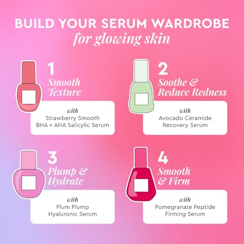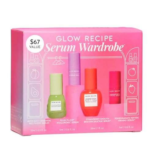 Specification: Glow Recipe Serum Travel Size Skin Care Set – Avocado Ceramide Serum + Strawberry Smooth AHA BHA Serum + Plum Plump Hyaluronic Acid Serum + Pomegranate Peptide Firming Serum (4 Count)