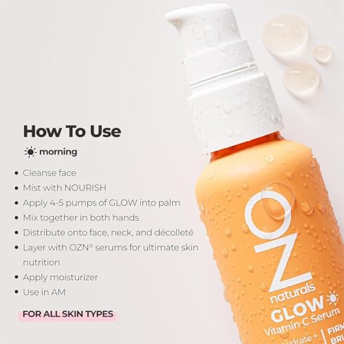 Begin your journey to a luminous complexion with OZNATURALS GLOW Serum from the FEED THE FACE product line. This starter serum, packed with potent antioxidants like vitamin C, rose hips, and astaxanthin, brightens and clears your skin while reducing age spots.FIRM AND BRIGHTEN: Transform your skin with this powerful serum designed to firm and brighten your complexion. OZNATURALS GLOW Serum works its magic to help you achieve a more youthful, radiant appearance, making it an essential part of your daily skincare routine.PROTECT FROM SUN DAMAGE: This antioxidant-rich serum not only revitalizes your skin but also provides a natural defense against future sun damage. Incorporate OZNATURALS GLOW Serum into your daily regimen to keep your skin protected and maintain a healthy, glowing complexion.BRIGHTEN YOUR MORNING ROUTINE: Transform your morning routine with these easy steps: cleanse your face, then mist with NOURISH for a refreshing boost. Apply 4-5 pumps of GLOW Serum onto your palm, press your hands together, and distribute evenly onto your face, neck, and décolleté for a radiant complexion. For maximum skin nutrition, layer with other OZN serums. Finally, apply your favorite OZN moisturizer to seal in the goodness. Use this regimen every morning to start your day off right.HOLISTIC APPROACH & COLD PROCESSED: Formulated by a licensed holistic aesthetician, OZNATURALS products prioritize your skin’s health and overall well-being. Cold processed manufacturing ensures that each formula retains its maximum potency and effectiveness, resulting in exceptional skincare products designed to bring out your skin’s natural radiance.